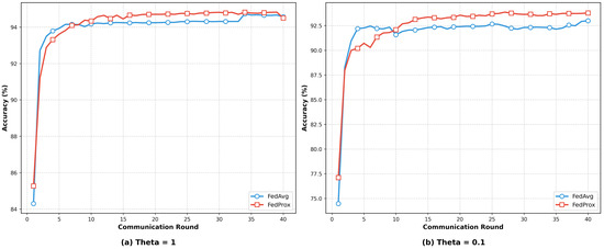 In addition, the experimental results on N-BaIoT were also recorded, as presented in Table 11. When , FedProx outperformed FedAvg in overall performance. Specifically, FedAvg achieved an accuracy and F1-score of 86.49% and 82.16%, respectively, whereas FedProx improved these metrics, achieving 87.70% and 83.52%. In terms of the FNR, FedProx reduced it from 13.51% to 12.30%. However, the FPR exhibited a slight increase from 1.87% to 1.90%. Under , FedProx outperformed FedAvg, achieving an accuracy and F1-score of 83.81% and 78.24%, respectively, compared to the 82.73% and 77.53% for FedAvg, respectively. The FNR of FedProx decreased from 17.27% to 16.19%, while the FPR slightly declined from 2.23% to 2.21%. It is worth noting that, similar to its runtime on Edge-IIoT, FedProx also incurred a significant increase in computational overhead on N-BaIoT.