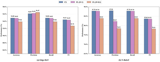 To comprehensively assess the performance of FD-IDS, we conducted a comparative analysis between FD-IDS and CL. In the CL approach, data from all clients are gathered on a central server to create a consolidated training dataset, and the entire model training and updating process is carried out solely on the central server. To ensure the fairness of the experiments and comparability of the results, we employed the same classification model structure and hyperparameters for both CL and FL. The experimental results on Edge-IIoT and N-BaIoT are illustrated in Figure 10. As shown in the figure, both datasets exhibited similar performance trends. Under the low-Non-IID scenario, the performance of FL closely approximated that of CL. This indicates that the FD-IDS method can achieve detection performance comparable to CL when the data distribution differences across clients are relatively small. On the other hand, while high-Non-IID data introduced certain performance challenges for FL, which was more pronounced in the N-BaIoT dataset, FD-IDS still demonstrated reliable performance, maintaining a reasonable gap compared to CL. Although CL exhibited slightly superior performance, it requires transferring all raw data to the central server, which poses significant privacy risks. Additionally, CL is heavily reliant on the central server. As the data scale increases, the central server faces substantial storage and computational demands, potentially creating severe performance bottlenecks in practical applications. In contrast, FD-IDS effectively mitigates these challenges by leveraging FL.
