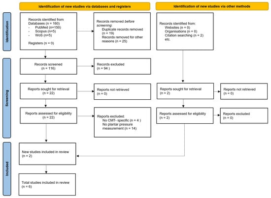 A comprehensive search of the existing literature pertaining to plantar pressure distribution in CMT patients was performed across three prominent databases: PubMed, Scopus, and Web of Science. The search strategy combined the following keywords: “Charcot-Marie-Tooth” AND (plantar pressure distribution OR baropodometry OR in-shoe sensors OR gait analysis). All keywords were meticulously examined both individually and combined with their Medical Subject Heading (MeSH) terms. The search included all studies published until 1 May 2025. Reference lists of relevant articles were also screened manually. Two authors (G.D.P. and F.S.) independently conducted the literature search. The protocol was registered in the PROSPERO database (Registration ID: CRD420251053747). This systematic review was conducted according to the PRISMA 2020 guidelines [].