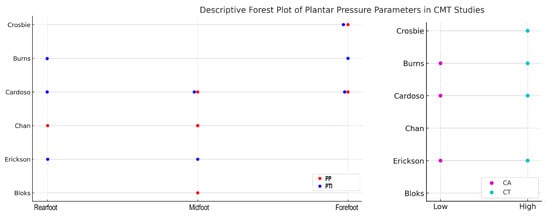 Normative values used for comparison in the included studies were generally derived from age-matched healthy control groups or from validated baropodometric reference databases []. Future comparisons should utilize pediatric- or adult-specific reference data accordingly. While these sources provide a useful benchmark for identifying deviations in plantar pressure patterns, it is important to note that variations in equipment calibration, walking protocols, and population characteristics may affect the consistency of such reference data across studies. Nonetheless, the uniformity in observed pressure patterns reinforces the clinical relevance of pressure mapping in CMT management. Despite these limitations, to our knowledge, this is the first systematic review on the topic. This study aimed to increase interest in this less-studied field and provide new insights into the topic in order to help future research to adopt standardized protocols, larger multicenter cohorts, and formal analyses linking specific surgical techniques or orthotic designs to quantitative improvements in plantar pressure metrics.