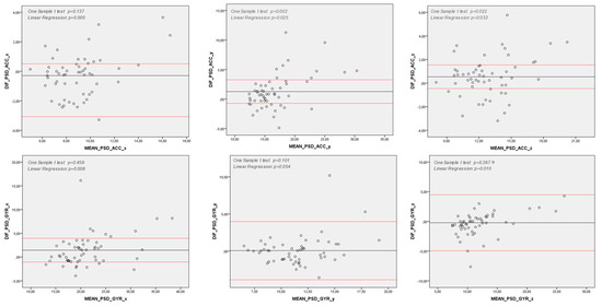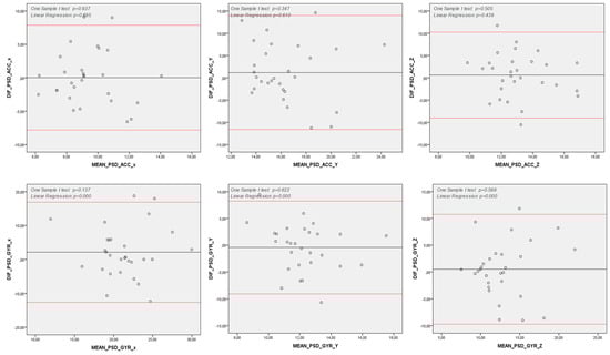 Bland–Altman Analysis of Spectral Variables. y axis: Difference between measures (Commercial IMU and Smart Watch) (Hz); x axle: Mean between measures (Commercial IMU and Smart Watch) (Hz); Note: DIF: Difference between measures (Commercial IMU and Smart Watch); PSD: Power Spectral Density; ACC: Acceleration (degrees per second); GYR: Angular Velocity (degrees per second); x, y and z: pitch, yaw and roll axes; Note 2: One Sample T-Test p < 0.05: differences between Commercial IMU and Smart Watch are significantly higher than zero; hence, there is not agreement between those measurement methods; Note 3: Linear Regression p < 0.05: differences between Commercial IMU and Smart Watch tend to concentrate either above or below the differences’ mean; hence, there is a proportion bias between those measurement methods.