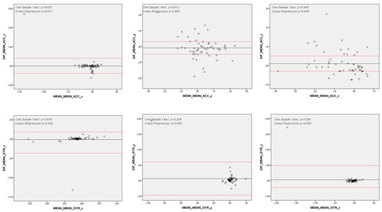 Reliability of Spatiotemporal Variables—Bland-Altman Analysis. y axis: Difference between measures (First and second measures); x axis: Mean between measures (First and second measures); Note: DIF: Difference between measures (First and second measures); ACC: Acceleration (degrees per second); GYR: Angular Velocity (degrees per second); x, y and z: pitch, yaw and roll axes; Note 2: One Sample T Test p < 0.05: differences between first and second measures are significantly higher than zero; hence, there is not agreement between these measurement methods; Note 3: Linear Regression p < 0.05: differences between First and second measures tend to concentrate either above or below the differences’ mean; hence, there is a proportional bias between these consecutive measures.