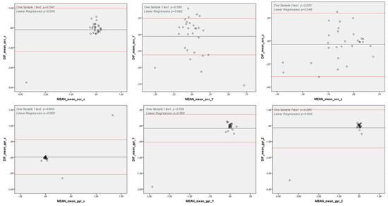 Reliability analysis of the test was conducted using the Bland−Altman method [41,42] to assess the agreement between two consecutively taken measurements from each subject. Our findings revealed that, for none of the variables studied in the proposed method, the difference between the first and second measurements was significantly greater than zero.