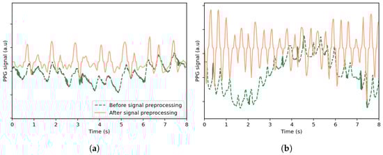 - Signal PreprocessingOutliers in the PPG signal are identified as values that are either negative or exceed three standard deviations above the mean of the positive values in the signal. As such, a value p[n] in the PPG signal is considered an outlier ifwhere and are the mean and standard deviation computed over the positive values of a specified PPG signal.Outlier values are subsequently replaced using linear interpolation between neighboring valid values to ensure continuity. A bandpass filter is then applied to the signal using a fifth-order Butterworth filter to retain frequencies between 0.5 Hz and 5 Hz. Resampling is also performed using cubic interpolation to ensure that the PPG and accelerometer signals have the same sampling frequency. Each signal is first mapped onto a uniformly spaced time axis derived from its original timestamps and then interpolated onto a new uniform time grid at the desired sampling rate. For uniformity, the signals are analyzed using a sliding window and a window shift whose sizes match the analysis of the publicly available datasets. A median filter with a kernel size of 7 and a moving average filter with a window size of 3 are also applied to reduce noise and smooth the signal.These operations are defined in the following equations:where is the output of the median filter, and is the output of the moving average filter.Figure 1 illustrates the effects of preprocessing on selected PPG signal segments from the UTOKYO dataset for both walking and running conditions. As shown, the processed signals exhibit clearer pulse peaks and reduced baseline drift.