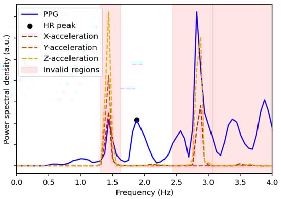 Figure 2. Power spectral density comparison between the PPG signal and the x-, y-, and z-acceleration signals for a selected time window of the UTOKYO dataset. The estimated HR peak from the spectral analysis is also labeled, which corresponds to 113 bpm and matches the ground truth measurement. The regions with invalid peaks are also shaded in red.Examples of the spectral analysis step applied to specified walking and running sessions from the UTOKYO dataset are shown in panels (a) and (b) of Figure 3, respectively.