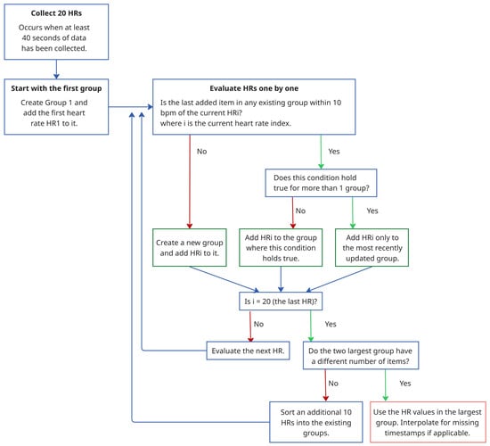 - Stability- and Aggregation-Based Heart Rate Tracking (SAB-HRT) To ensure accurate heart rate estimation, a heart rate tracking step is implemented. Like many existing algorithms, this step aims to prevent large fluctuations in heart rate between subsequent measurements in a sequence. This step can be applied continuously and begins when 20 HR values are collected, which occurs every 40 s when using a sliding window with a 2 s shift. The algorithm traverses these HR values sequentially to form stability groups, starting by assigning the first HR value to an initial group. Then, for each subsequent HR, the algorithm verifies whether the difference between the last element of each group is within 10 bpm of the current HR. If the difference is within this threshold for one or more groups, the HR is added to the most recently updated group only. Otherwise, a new group is created to accommodate the HR value. Thus, each HR value should be assigned to a single group only. After all the HR values are grouped, the largest group is selected as representing the HR values for this time period. At timestamps with missing HR values within the selected group, the HR values are interpolated to ensure continuity. If multiple groups have the same size, the algorithm extends the analysis window by half its original size (20 s) and repeats the grouping process. The logic for this process is visualized in the flowchart in Figure 4. As a final step, a continuous moving average filter with a 30 s window is applied to smooth the output signal and enhance signal readability. Importantly, the 30 s window is a conservative choice; our tests show that the size can be reduced to 10 s while keeping the MAE difference minimal.