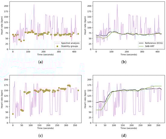 Figure 5. Identification of the stability group points from the spectral heart rate estimates for a specified (a) walking session and (c) running session from the UTOKYO dataset. The post-processing step, where the selected points are connected and smoothed to produce a continuous heart rate signal, are shown in (b) and (d), respectively.