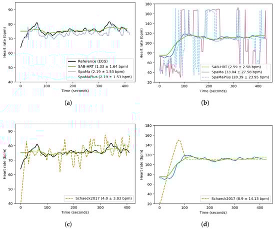 Figure 6 compares the reconstructed heart rates for two sessions from the UTOKYO dataset using the three classical methods and the current method. Figure 6a,c correspond to an indoor walking session recorded under low-noise conditions. The SpaMa and SpaMaPlus methods both yielded MAEs of 2.19 bpm, while the proposed algorithm achieved an MAE of 1.33 bpm, and theSchaeck2017 method obtained an MAE of 4.0 bpm. In contrast, Figure 6b,d present an outdoor running session with substantially higher noise levels. Under these conditions, the performance of SpaMa and SpaMaPlus deteriorates significantly, with MAEs of 33.0 and 20.4 bpm, respectively. The current method remains more robust in this high-noise environment, achieving an MAE of 2.6 bpm. The Schaeck2017 method yields an MAE of 8.9 bpm. These results suggest that while SpaMa and SpaMaPlus can be effective in evaluating signals with less motion artifacts, their application may be limited in real-world scenarios.