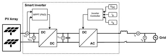 PV plant detailed model: PV array with a two-stage converter: (i) DC–DC boost converter with a maximum power point tracking (MPPT) controller based on the perturb and observe (P&O) method, and (ii) inverter with its controller; connected to the grid.