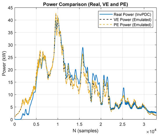 Several validation tests were carried out to benchmark the model against real plant data. Figure 3 illustrates one of the most challenging days in the test set, a day with low irradiance and scattered clouds. The real power output is shown with a blue line, the physical entity (PE) with a yellow dashed line, and the virtual entity (VE) with a black dashed line. To quantify the model performance, the main error metrics are summarized in Table 3.