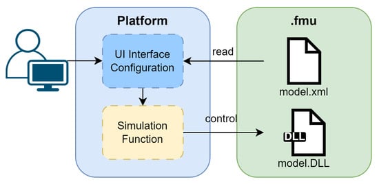 The use of FMUs provides several advantages in terms of modularity, portability, and interoperability. Figure 4 illustrates a typical interaction with a platform using an FMU. On the left, a user interacts with the configuration interface (blue), adjusting parameters relevant to the execution. These settings influence the control block (yellow), which is responsible for executing the appropriate control logic. On the right side, the FMU itself is shown. It consists of two main components: (i) model.xml, which describes the model structure, parameters, and metadata; and (ii) model.dll, which contains the compiled model logic and functions in C, specific to a given operating system. This architecture enables the efficient configuration and execution of models using encapsulated FMU files, promoting compatibility and reuse across heterogeneous frameworks.