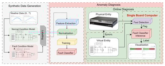 This section details the implementation of the DT, as illustrated in Figure 5, which outlines the implementation process of the DT. The implementation begins with a detailed physical model of the PV plant, emulated in real time using an HIL setup. This configuration enables the generation of synthetic data, which is automatically labelled by a dedicated process. The labelled dataset is then used to perform offline training of an anomaly classification model. Once trained, the model is deployed on an SBC, specifically, a Raspberry Pi 5 [], to perform real-time fault diagnosis within the PV system.