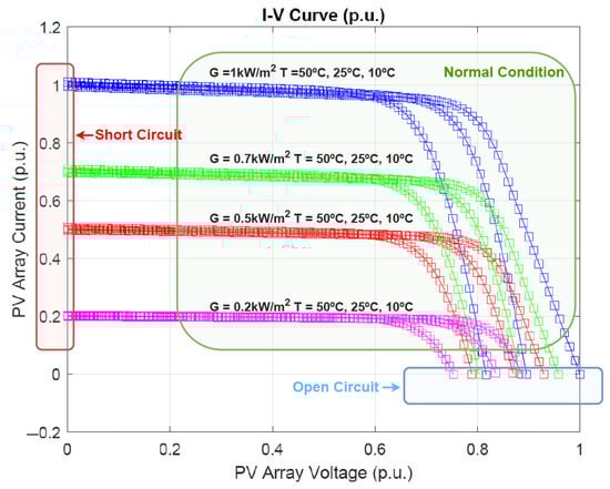Synthetic data generation was carried out with consideration of PV technology characteristics, as illustrated in Figure 6. Data were generated under varying irradiance and temperature conditions to comprehensively cover all possible operating modes of the system. It is important to note that the system’s dynamic behavior in response to a fault tends to shift toward specific regions of the I–V curve depending on the fault type. For instance, in the case of an open-circuit fault, the voltage approaches the open-circuit voltage while the current drops to zero. Conversely, in a short-circuit fault, the voltage falls to zero and the current approaches the short-circuit current. All other points along the I–V curve are considered to represent normal operating conditions. This fault-informed modeling ensures that the synthetic dataset realistically captures the system’s response to different failure scenarios, thereby improving the robustness and reliability of the diagnostic method.
