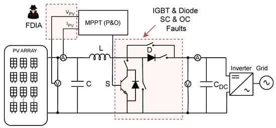 Photovoltaic plant architecture with IGBT and diode open- and short-circuit faults, and FDIAs on MPPT sensors.