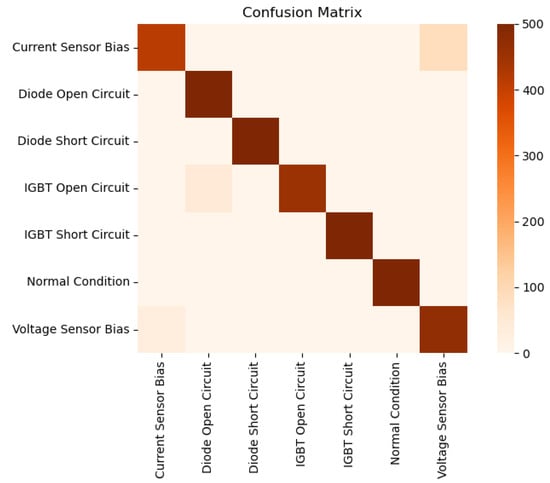 The results shown in Table 9 and Figure 8 demonstrate that the system is highly effective at detecting most fault conditions, particularly critical faults such as Diode Short Circuit and IGBT Short Circuit, for which perfect precision, recall, and F1-scores are achieved. It can also be observed that the system distinguishes well between Diode Open Circuit and IGBT Open Circuit, although there are a few misclassifications due to the similarity of the waveform patterns associated with these fault types.