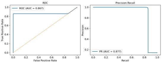The performance of the model was evaluated using the ROC and Precision–Recall curves, as shown in Figure 9. The ROC curve demonstrates strong discriminative ability, with an area under the curve (AUC) of 0.867, indicating the model’s robustness in distinguishing between positive and negative classes.