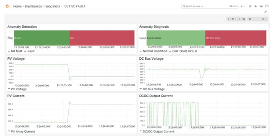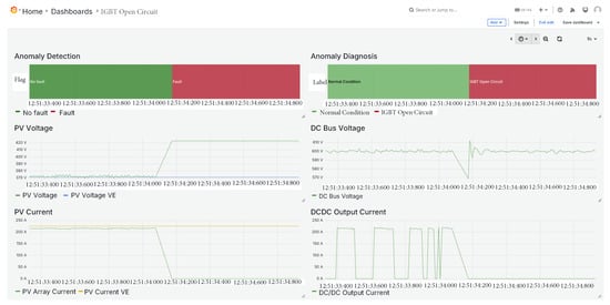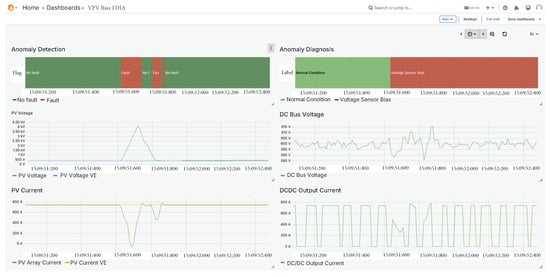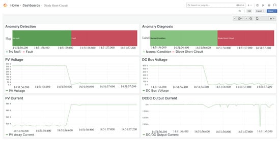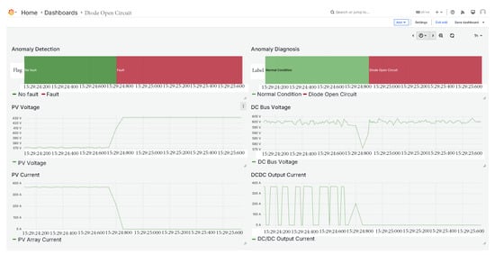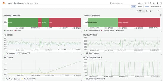 This subsection describes the complete data handling pipeline, including a structured storage in the database for subsequent use by the anomaly diagnosis service. The system is designed to operate in real time, ensuring that measurements from the physical system are reliably captured, filtered, and normalized before being inserted into the time-series database. The data flow begins with the reception of communication packets containing sensor readings from the PV plant, which are parsed and queued for processing. These signals are then used to compute diagnostic features and feed the DT-based fault detection mechanism. Simultaneously, all raw and processed signals are timestamped and logged into an InfluxDB [] instance. This architecture allows for scalable operation of the anomaly detection pipeline and enables both real-time monitoring and historical analysis of PV plant behavior. All raw and processed signals, along with detection flags and classification outputs, are timestamped and stored in an InfluxDB time-series database. To support real-time monitoring and intuitive visualization, the system integrates Grafana [], which provides interactive dashboards for inspecting signals, detecting anomalies, and tracking fault classifications in a user-friendly interface.