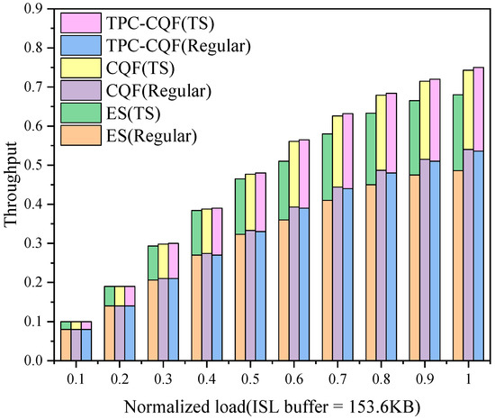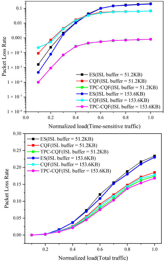 As shown in Figure 7, TPC-CQF exhibits a lower packet loss ratio for TSFs compared to CQF and ES across various loads, maintaining relatively stable performance under different ISL buffer sizes. Additionally, TPC-CQF demonstrates the best performance in terms of packet loss ratio for total traffic. While CQF can also reduce packet loss ratios, its performance for TSF packet loss is the worst under low load conditions due to its strict gating mechanism and limited queue forwarding capability for time-sensitive flows.