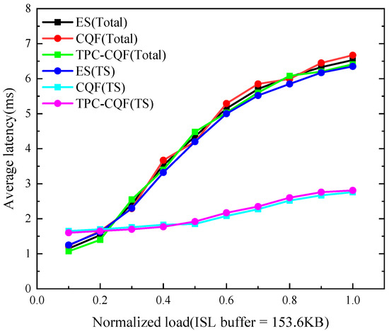 The average delay reflects the time from packet transmission to reception (excluding propagation delay). We calculated the average delay for both TSFs and total traffic across different mechanisms. Figure 8 shows that TPC-CQF’s TSFs delay is lower than that of ES but slightly higher than CQF under high load, while the delay for total traffic may be slightly higher.