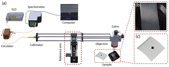 The spectral-domain optical coherence tomography (SD-OCT) system built in this study is shown in Figure 1a. The light source is a super luminescent light-emitting diode with a center wavelength of 850 nm, a bandwidth of 50 nm, and an output power of 15 mW. The axial resolution of the system is . The incident light is split into the sample arm and the reference arm by a beam splitter with a splitting ratio of 90:10 to enhance the signal from the samples. A dispersion compensator with the focusing lens is incorporated in the reference arm to minimize the dispersion mismatch between two arms. The interferogram formed from the backscattering of the sample arm and the back-reflecting of the reference arm is then recorded using a spectrometer with 0.05 nm spectral resolution.