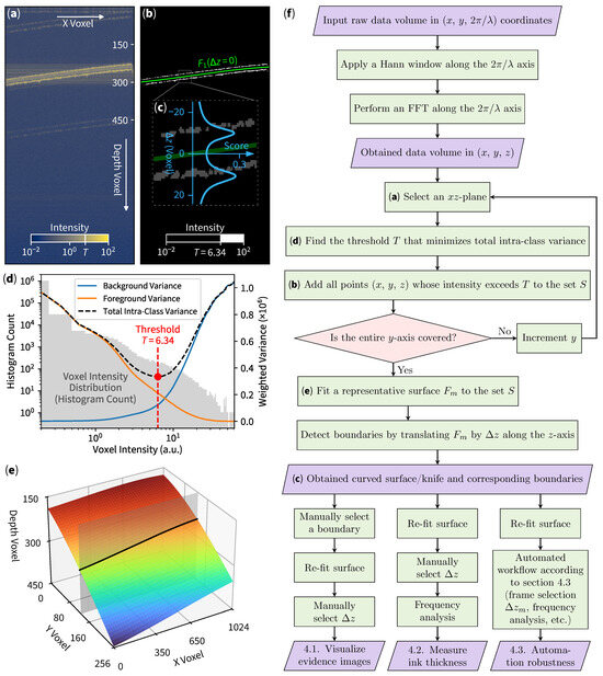 Curved slicing method. (a) Original B-scan (cross-sectional) slice with threshold indicated as T. (b) Image after binarization (white voxels) and surface-fitting (green line). (c) Inset indicating boundary score for automated boundary detection. (d) Otsu’s thresholding operation, with slice voxel histogram in background (left axis) and variances calculations in foreground (right axis). (e) 3D surface indicating curved en face slice with the gray sheet as a cross-sectional B-scan used in (a,b). (f) Flow chart describing our method.