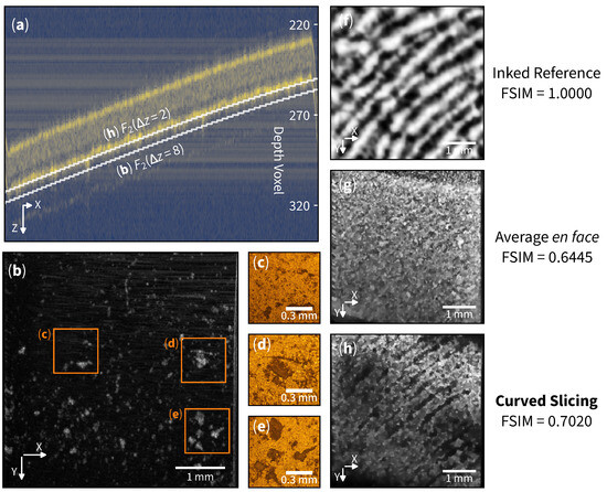 The average en face image traditionally employed in biological sample analysis, as illustrated in Figure 3g, faces a significant challenge in visualizing sub-surface structures within the volume. A profile of curved versus flat slicing is also shown in the appendix (Figure A1). This limitation arises from the image (signal) being overshadowed by strong material reflections (interference). Unlike biological samples with complex structures, where each substructure typically exhibits high contrast (either high reflection or high absorption), the fingerprint information in this sample is confined to the superficial layers of the tape with relatively low contrast.