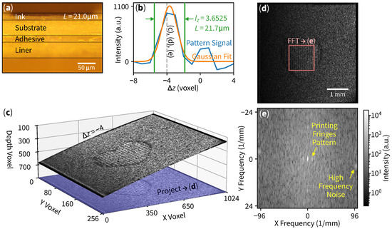 The interoperability between our curved slicing method and digital signal processing techniques facilitates ink thickness measurement applications. Our objective is to effectively detect and count layers within the material’s structure. We used OCT to scan a thermal-printed label (surface-side), as indicated in Figure 1c, with its corresponding cross-sectional microscopic image Figure 4a.