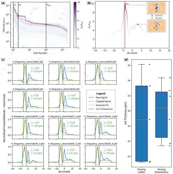 Figure 5. Automated ink thickness measurement results. (a) Intensity distribution sorted in descending order; each line represents each slice , and the color of each line represents the ratio of each slice. (b) Ratio according to each , where the maximum ratio corresponds to candidate slice . The top inset shows dominant and recessive frequency-domain data points of , where the points are aligned according to the inked pattern. The bottom inset shows frequency-domain data points of a non-candidate slice, where points are distributed in a random manner (with higher spatial frequency indicating possible noise). (c) Signal processing results of each case. (d) Box plot of measurement results, with standard deviations of for different labels and for different orientations.
