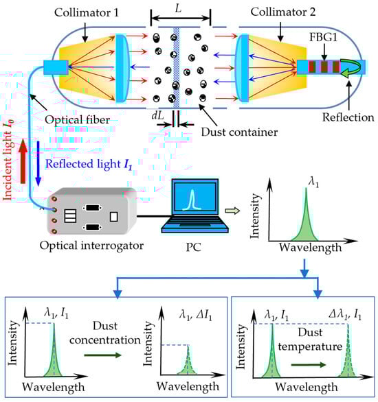 The internal light source of the optical interrogator generates the incident light with an intensity of I0, which enters Collimator 1 on the left through a single-mode fiber. The broadband light, after amplification, enters the dust container in the form of parallel beams. The light intensity attenuates due to the reflection and scattering by dust particles. The light then enters Collimator 2 and eventually the FBG on the right side. The part of the light consistent with the central wavelength of the FBG reflects and passes through Collimator 2, the dust container, where the light intensity is again attenuated, and Collimator 1. Finally, the reflected light returns to the optical interrogator. Demodulation yields the real-time intensity I1 and central wavelength λ1 of the FBG’s reflection spectrum.
