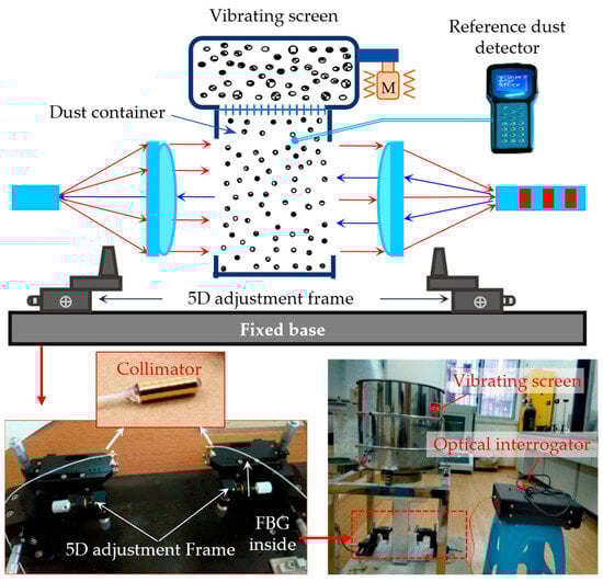 As shown in Figure 1, the proposed dust measurement system mainly includes two aligned optical fiber collimators, an FBG, a dust container, a self-developed optical interrogator, and a computer. The fiber pigtail of collimator1 is connected to an optical interrogator via an FC/APC fiber patch cord. The FBG is fabricated in the fiber pigtail of collimator 2 using phase mask technology [23]. The dust container is located between the two collimators.