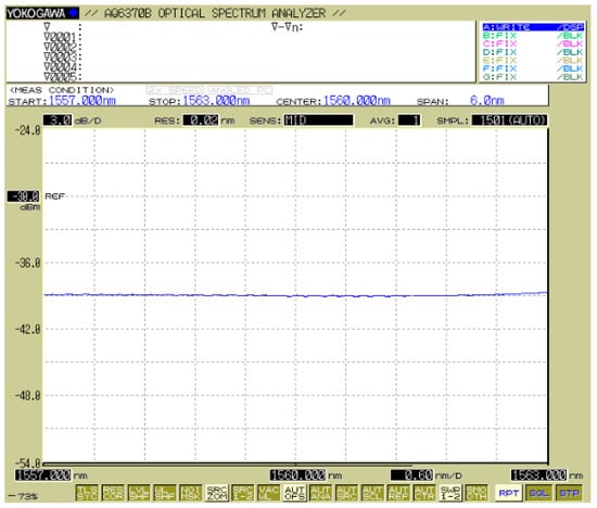 The self-developed FBG interrogator collects the reflected signals from the FBG (wavelength accuracy: ±3 pm, intensity accuracy: 1 mW, acquisition frequency: 1 Hz). The broadband light source inside the interrogator has a power output of 20 mW and a constant optical power within the 1557.0–1563.0 nm wavelength, as shown in Figure 3, ensuring no change in the optical power with the drift of the FBG wavelength. The original central wavelength of the selected FBG is 1560.1 nm, which lies within the constant optical power range of the light source. During the experiments, a commercial dust detector (EL-1000, Qingdao Yilan Environmental Protection Engineering Co. Ltd., Qingdao, China) with a measurement range of 0–100 g/m3 was used as a reference. Moreover, the proposed dust detector comes with a 500 μm spot diameter of the fiber collimators and a working distance range of 10–15 cm.