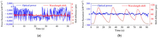 From Figure 4a, the intensity curve of the FBG reflectance spectrum oscillates with random changes in dust concentration. On the other hand, the wavelength curve is obviously not sensitive to the change in dust concentration and consistently stable within the range of ±3 pm, corresponding to the accuracy of the interrogator. Conversely, from Figure 4b, the wavelength curve of the FBG shows periodic fluctuations of “rise up and fall down”, corresponding to the cycles of “heating-pause” of the external heating source. Temperature variation does not influence the intensity curve, which is stable within a range of ±0.1 mW.