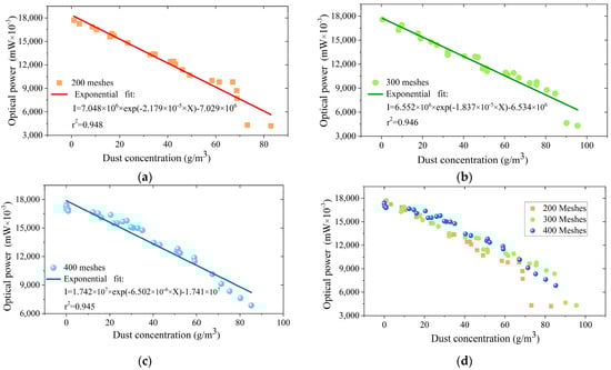 Relationship between the optical intensity of the FBG and dust concentrations of (a) 200 meshes, (b) 300 meshes, and (c) 400 meshes. (d) Comparison of test results for different meshes.