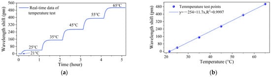 A temperature calibration experiment was conducted within the range of 21~65 °C with increments of 10 °C by an adjustable chamber (GPL-1, Espec Test Equipment Guangdong Co., Ltd., Guangzhou, China; accuracy: ±0.3 °C). As indicated in the dust container, the real-time wavelength–response curves of the FBG perfectly match the temperature variation trend. The relationship between the temperature and the wavelength shift of the FBG is presented in Figure 6b. From the linear-fitted curve, the temperature sensitivity of the sensor is 11.7 pm/°C with R2 = 0.9997.