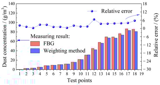 To evaluate the accuracy of the proposed detector, a comparative experiment was conducted against the weighing method—the standard reference for an accurate dust concentration measurement. We chose 200-mesh wheat dust as the test object and randomly sampled 18 measurement points with different concentrations. By reading the intensity of the FBG reflected spectrum, combined with the calibration fitting results, we could deduce the concentration measured by the proposed sensor. According to the basic principle of the weighing method, we collected the dust suspended in the dust container and used a high-precision balance to obtain the mass M. Knowing that the volume V of the dust container is 3.2 × 10−4 m3, the dust concentration C measured by the weighing method can be derived as C = M/V.