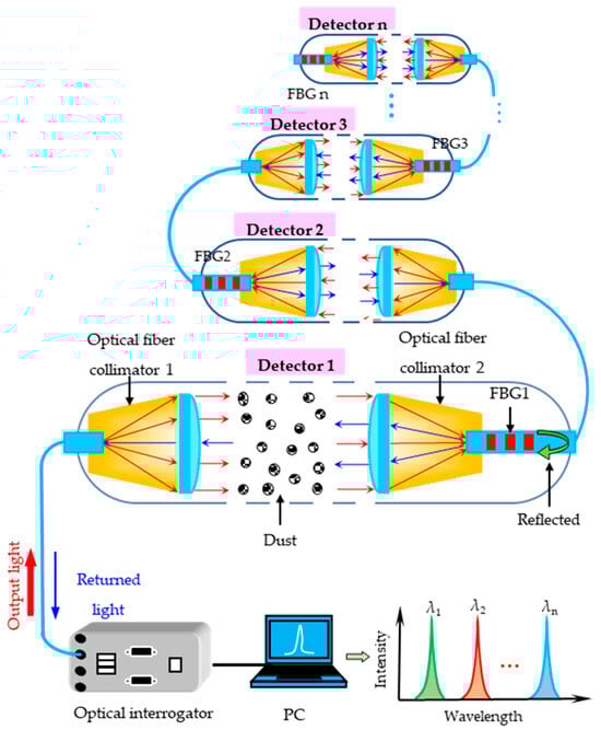 Fiber Bragg grating (FBG)-based sensing technology has gained significant importance for numerous applications due to its inherent advantages, such as immunity to electromagnetic interference and optical power fluctuations, small size, lightweight, and the capability for multiplexing multiple FBGs along a single fiber [20,21,22]. Leveraging these advantages, this research proposes an FBG-based dust detector that integrates FBG sensing with a modified light extinction method.