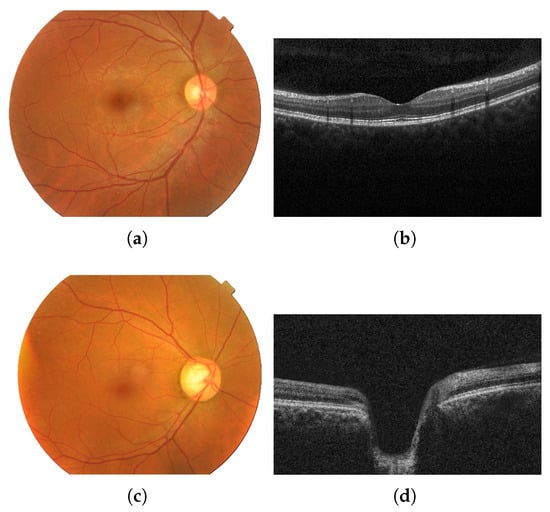 Fundus images show the optic disc cupping, pallor, and peripapillary signs, whereas OCT quantifies layer thickness and structural loss [29]. Figure 1 shows images of an eye with no diseases (a,b) and of an eye with glaucoma (c,d) from each modality (fundus and OCT).