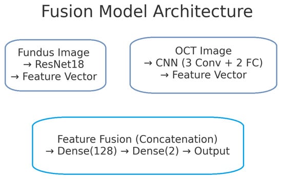 The proposed deep learning model for glaucoma detection has a dual-branch architecture as depicted in Figure 2. One branch processes fundus images and the other processes OCT images. Each branch is responsible for learning high-level features from its respective modality. The features extracted by the two branches are then combined (fused) at a later stage to form a joint representation, which is used for the final glaucoma classification. This design allows the model to capture modality-specific patterns (e.g., optic disc cupping in fundus images, retinal nerve fibre layer thinning in OCT scans) and also to learn interactions between modalities for a more informed decision.
