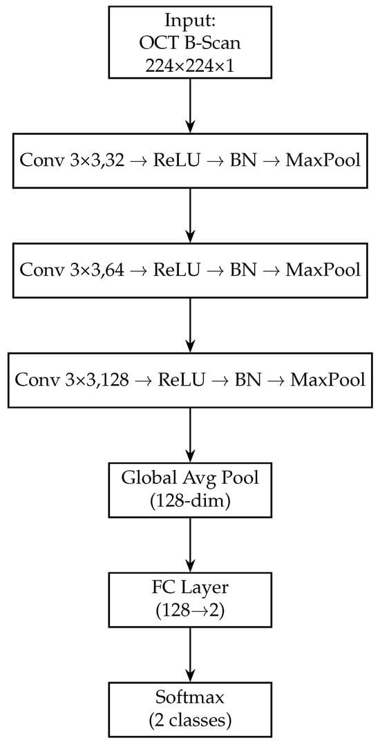 Block diagram of the OCT-only model (custom CNN). The OCT-Only model accepts a single 224 × 224 × 1 grayscale B-scan. It employs three successive convolutional blocks—each consisting of a 3 × 3 conv layer, ReLU activation, batch normalisation and max-pooling—expanding channel depth from 32 → 64 → 128. A global average-pooling layer then collapses spatial dimensions to a 128-dimensional feature vector. A final fully connected layer maps these features to 2 logits, followed by a softmax to yield normal/glaucoma probabilities. This lightweight architecture captures cross-sectional RNFL and optic-nerve-head structures.
