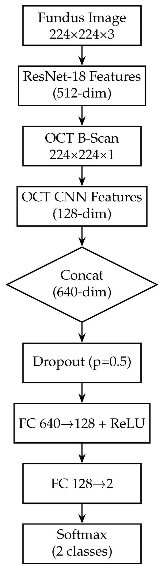 Next, we add a fully connected layer of 128 neurons (with ReLU activation) to further distil the OCT features. This dense layer takes the 256-dim pooled vector and produces a 128-dim output, analogous to the fundus branch. A dropout layer (rate 0.5) is applied after this dense layer during training to regularise the OCT branch. The 128-dimensional output from this dense layer represents the final feature vector produced by the OCT branch for each OCT image. Figure 4 shows the block diagram of the OCT-only model. Table 3 provides a layer-by-layer summary of the OCT branch architecture, including the dimensional changes at each stage.