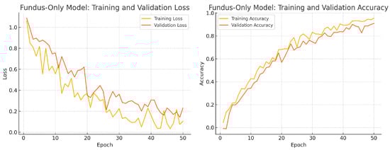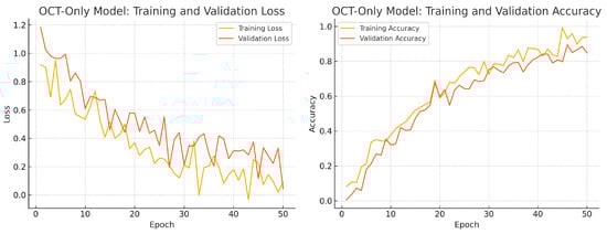 For OCT data augmentation, we employ a careful set of transformations to avoid physically implausible results. Small rotations (within ±5°) are applied to account for slight tilts during OCT acquisition. Horizontal flips are used to simulate scans of the opposite eye (since a left-right flip of an OCT scan mirrors the nasal and temporal retina, which is still a valid scenario across different eyes). We avoid vertical flips on OCT images because flipping an OCT upside down would invert the retinal layers (an unrealistic transformation). We also apply small random translations and scaling on OCT images (of similar magnitude as for fundus images) to account for minor shifts or zoom effects. Additionally, we introduce a low level of random Gaussian noise to some OCT training images to simulate variability in scan quality and noise conditions. As with fundus images, these augmentations are applied during training on the fly. By augmenting the OCT scans, we help the OCT branch learn invariant features and reduced overfitting, which is crucial given the relatively limited OCT sample size.