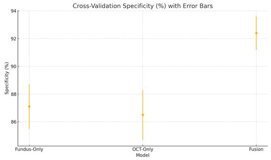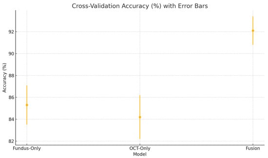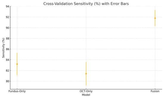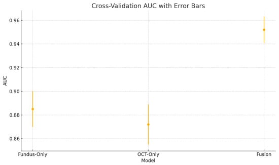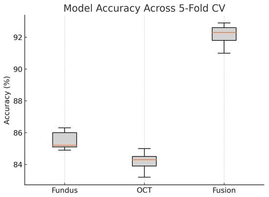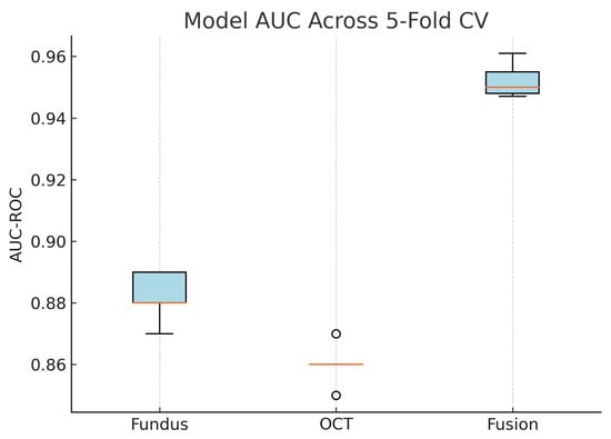 A study by Vairetti et al. used a bimodal solution that combined OCT and infrared reflectance (IR) images [33]. In their study, they found that their bimodal solution correctly classified age-related macular degeneration in a patient’s eye, whereas the unimodal (OCT image) had misclassified it as normal. The IR scan clearly highlighted hyporeflective drusen, which alone provides strong evidence of disease, whereas the OCT image exhibited only very subtle outer-retinal irregularities that would be difficult to interpret in isolation. When these two modalities were fused, both the surface reflectance lesions and the depth-resolved structural changes were simultaneously emphasised, greatly enhancing diagnostic confidence. This example demonstrates how bimodal integration outperformed unimodal analysis by combining complementary information.