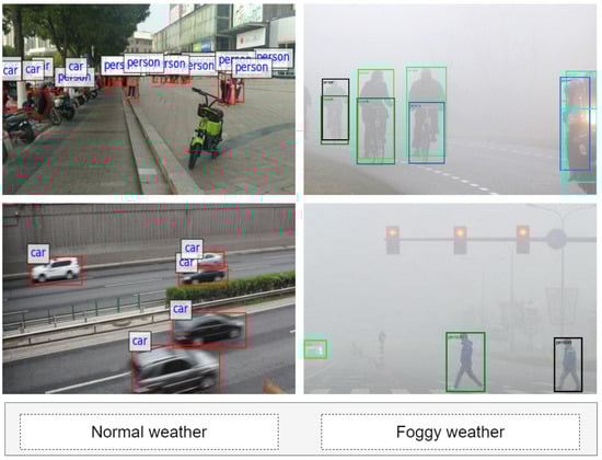 As illustrated in Figure 1, obstacle detection systems for visually impaired navigation encounter a range of significant challenges when transitioning from normal to foggy weather conditions. Under clear weather, obstacles such as pedestrians, vehicles, and bicycles present distinct boundaries and salient features, allowing for reliable detection. However, in foggy scenes, object boundaries become blurred and essential visual cues are greatly weakened, making it increasingly difficult for detection algorithms to distinguish obstacles from the background and leading to a higher likelihood of missed detections. At the same time, adverse weather introduces substantial background noise, which often generates dynamic artifacts resembling real obstacles, thereby increasing the rate of false positives. The inherent complexity and dynamic variability of real-world navigation scenes, including moving vehicles, groups of pedestrians, temporary obstructions, and fluctuating lighting, further exacerbate the instability of detection systems under such challenging conditions. These phenomena, clearly observed in Figure 1, highlight the urgent need for advanced, weather-adaptive obstacle detection frameworks capable of maintaining robust and accurate performance across a wide spectrum of adverse environments [].