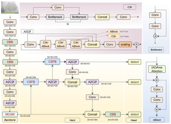 To address the complex challenges of obstacle detection for visually impaired navigation under foggy weather conditions, we propose YOLO-Extreme, an enhanced YOLOv12-based framework []. As illustrated in Figure 2, the proposed architecture incorporates three key modules: the Dual-Branch Bottleneck Block (DBB) [], the Multi-Dimensional Collaborative Attention Module (MCAM) [], and the Channel-Selective Fusion Block (CSFB) []. The DBB is integrated into both the backbone and neck of the network to simultaneously capture local spatial details and global semantic information, thereby improving the ability of the model to distinguish blurred or low-contrast obstacles caused by fog. The MCAM is placed at the end of the backbone and adaptively refines feature maps by aggregating attention across multiple spatial dimensions, which effectively suppresses background noise and emphasizes salient obstacle cues in cluttered scenes. The CSFB is embedded in the neck to dynamically recalibrate the channel-wise contributions of high- and low-resolution features, enabling robust and adaptive multi-scale feature fusion that is critical for stable detection in dynamic and complex environments.