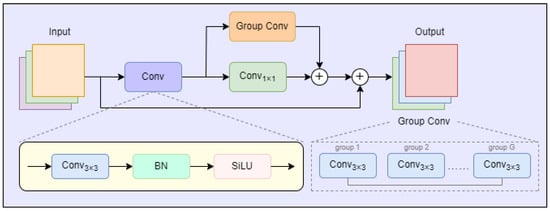 where denotes a convolution, is batch normalization, and denotes the SiLU activation function. This operation produces an intermediate feature map , which retains the spatial resolution of X and typically preserves the channel dimension ().