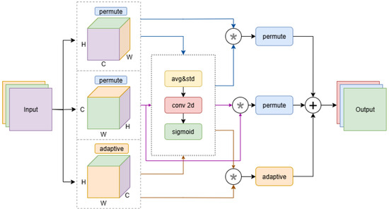 Attention generation and feature reweighting: Within each branch, the feature map is passed through a collaborative attention gate. Both the mean and standard deviation along the respective dimension are computed, concatenated, and processed with a 2D convolution and sigmoid activation to generate a dimension-specific attention map A: