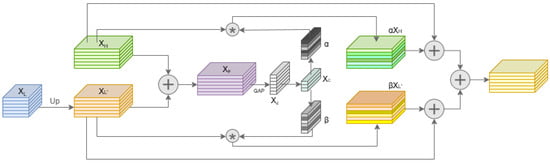 To adaptively control the channel-wise contributions of the two input features, is expanded via two independent fully connected layers, generating channel attention weights and for the high- and low-resolution branches, respectively:
