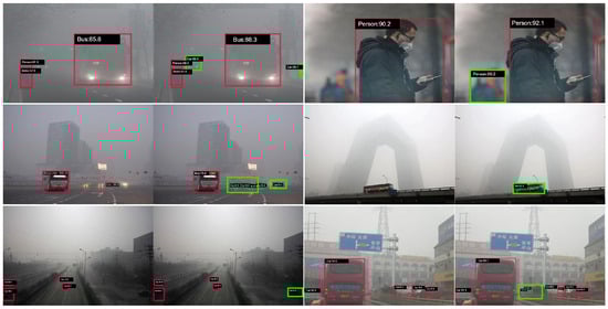 As illustrated in Figure 6, we provide a qualitative comparison of the detection results between the baseline YOLOv12 model (left) and our proposed method (right) under challenging foggy weather conditions. In each pair of images, the left side displays the results of YOLOv12, while the right side shows the results of our method. The red bounding boxes represent detections made by YOLOv12, and the green bounding boxes correspond to those identified by our method but missed by the baseline.