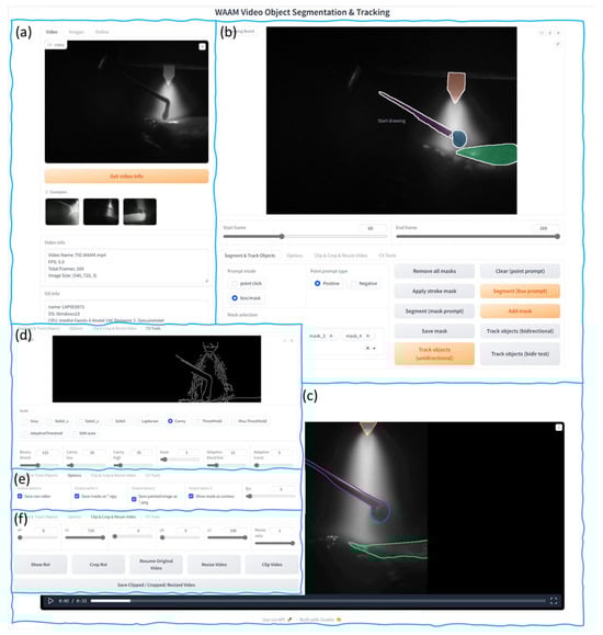 UI of the general interactive tool for WAAM video analysis. (a) Video import section, (b) reference frame segmentation tools and tracking model options, (c) video segmentation results, (d) computer vision tools area, (e) segmentation result saving options, (f) video clipping and editing tools.