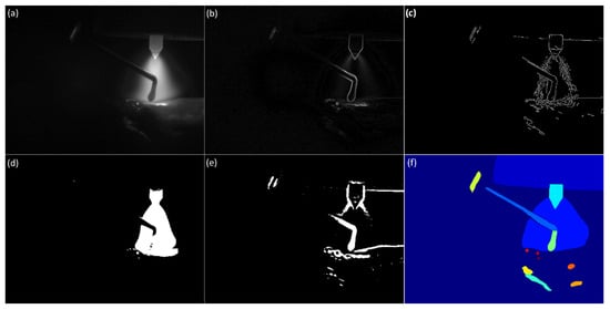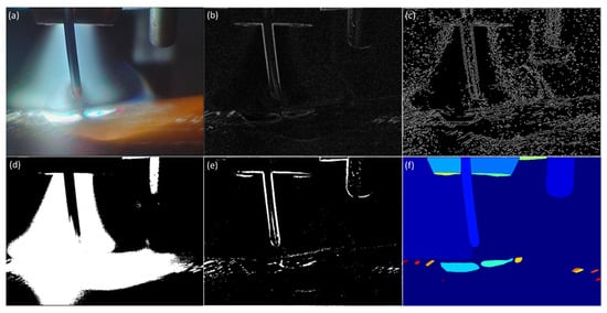 (a) Blur frame from a WAAM monitoring video, applying the (b) Sobel algorithm, (c) Canny algorithm, (d) Otsu thresh algorithm, (e) Adaptive thresh algorithm, and (f) Meta SAM to the frame.